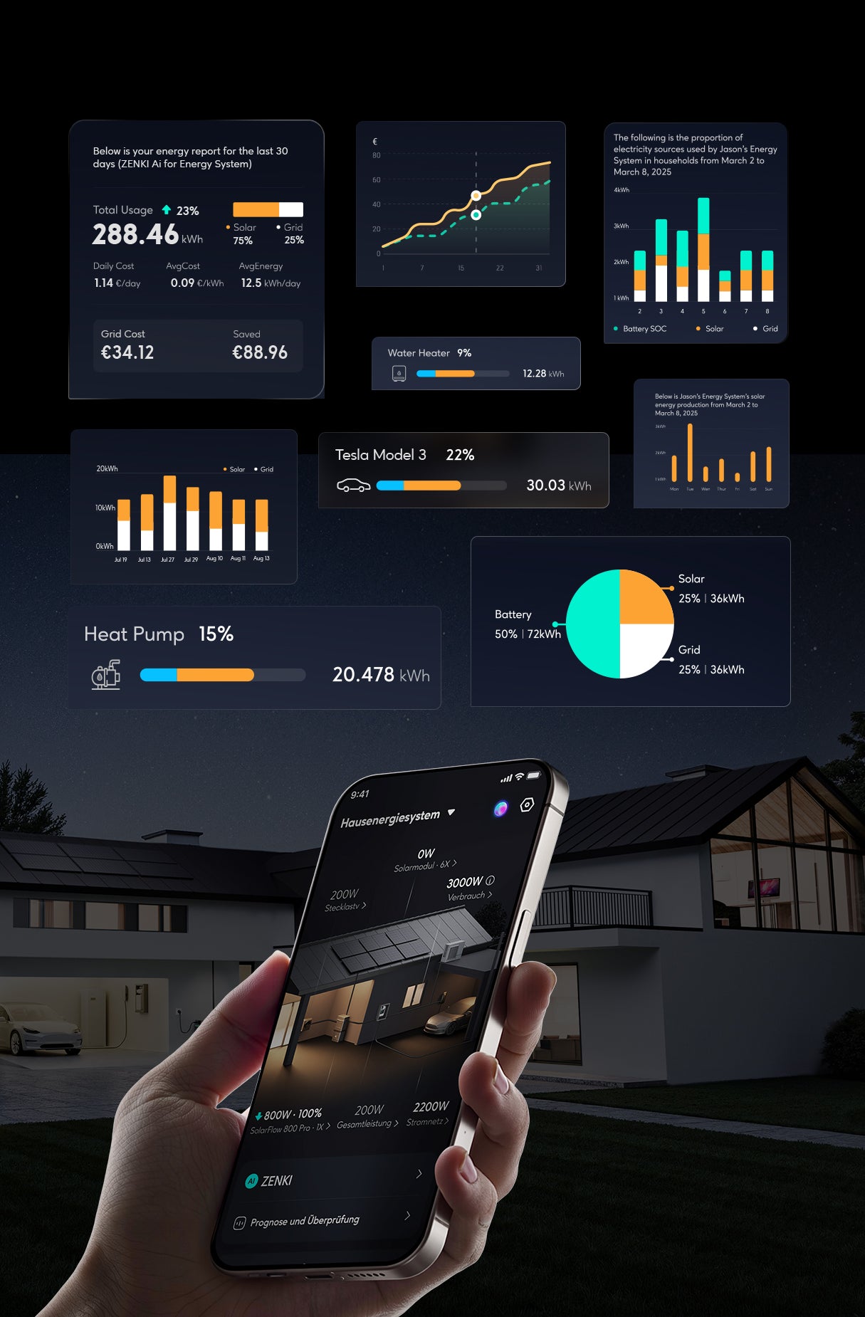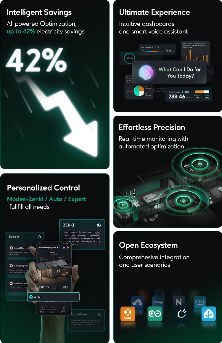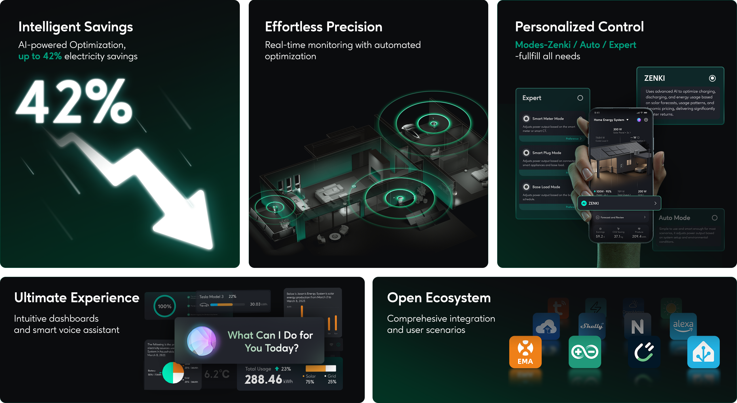 Zenki AI optimizes energy usage based on real-time electricity prices, weather forecasts, and consumption habits, prioritizing clean energy to maximize cost savings (up to 42%).